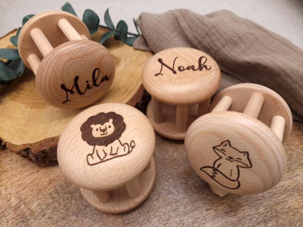 Mache aus der Rassel ein ganz besonderes Geschenk und lasse sie mit deinem Wunschnamen und/oder einem niedlichen Motiv gravieren.