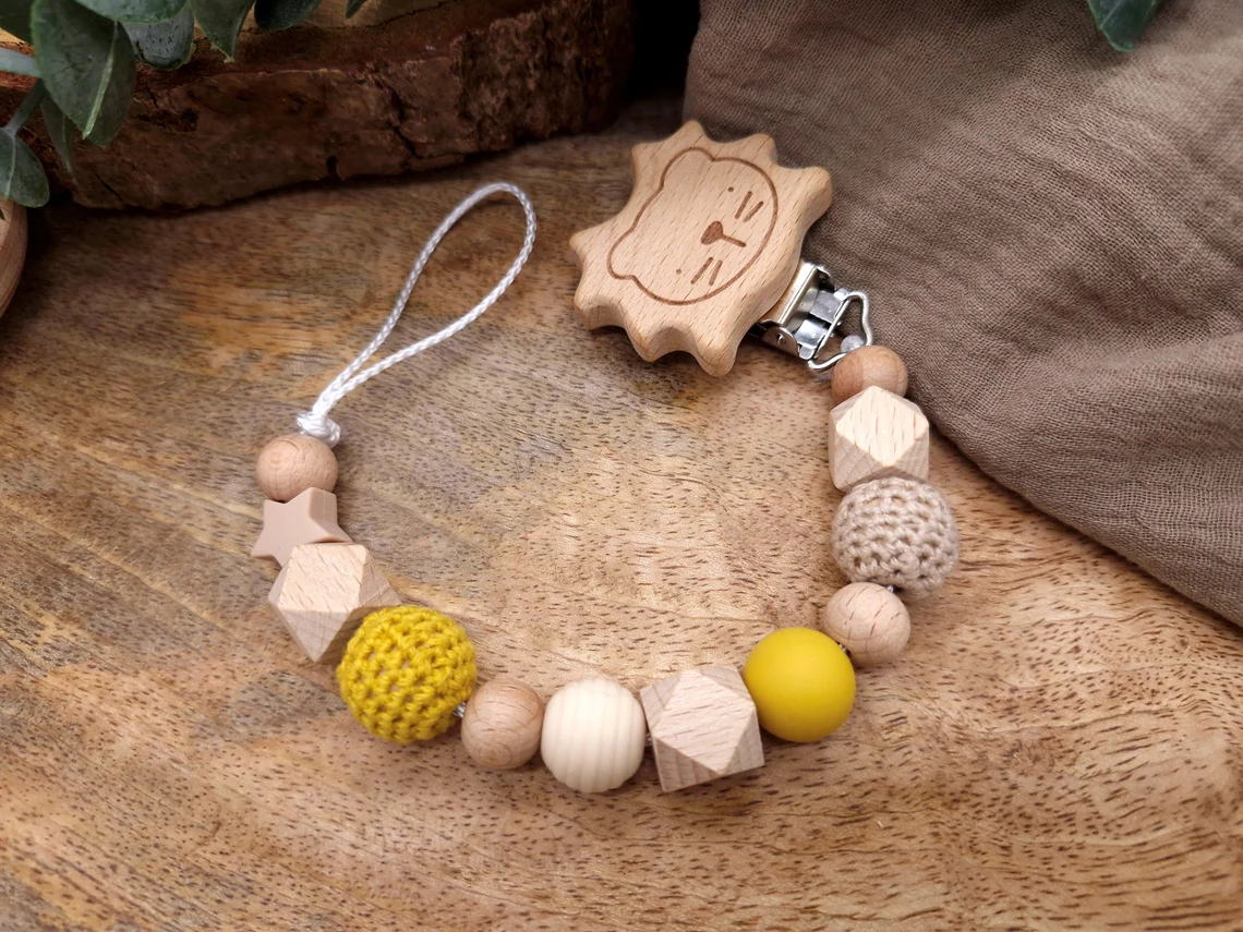 Wunderschöne Schnullerkette aus Holz-, Silikon- und Häkelperlen